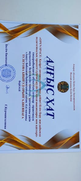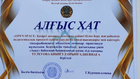 17.04.2025ж “ Қазіргі заманғы мектепке дейінгі білім беру жағдайында педагогикалық процесті сүйемелдеудің белсенді нысандары мен әдістері” тақырыбы бойынша облыстық семинар болып өтті. Семинарда “Бәйтерек” және “АҚҚУ” бөбекжай бақшасы ұжымымен бірлескен жұмыстар көрсетілді. Аққу” бөбекжай бақша тәрбиешісі Ибраимова Салтанат Қадыржанқызы “Мектепке дейінгі жастағы балаларға арналған мақал -мәтелдер “ тақырыбында оқу-әдістемелік жинағы таратылып “Алғыс хатпен” марапатталды.