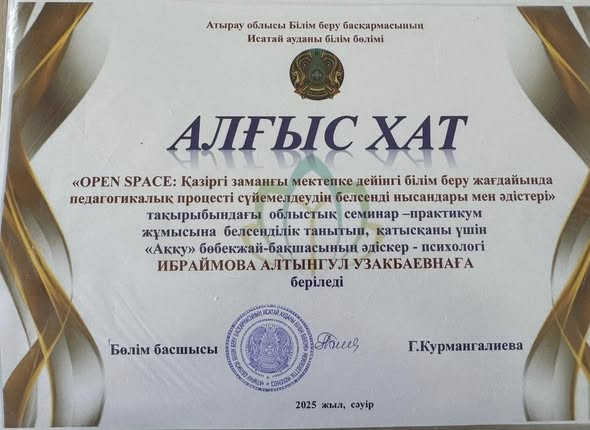 Психология секциясында психолог Ибраймова Алтынгул Ұзақбайқызы “Алғыс хатпен “ марапатталды